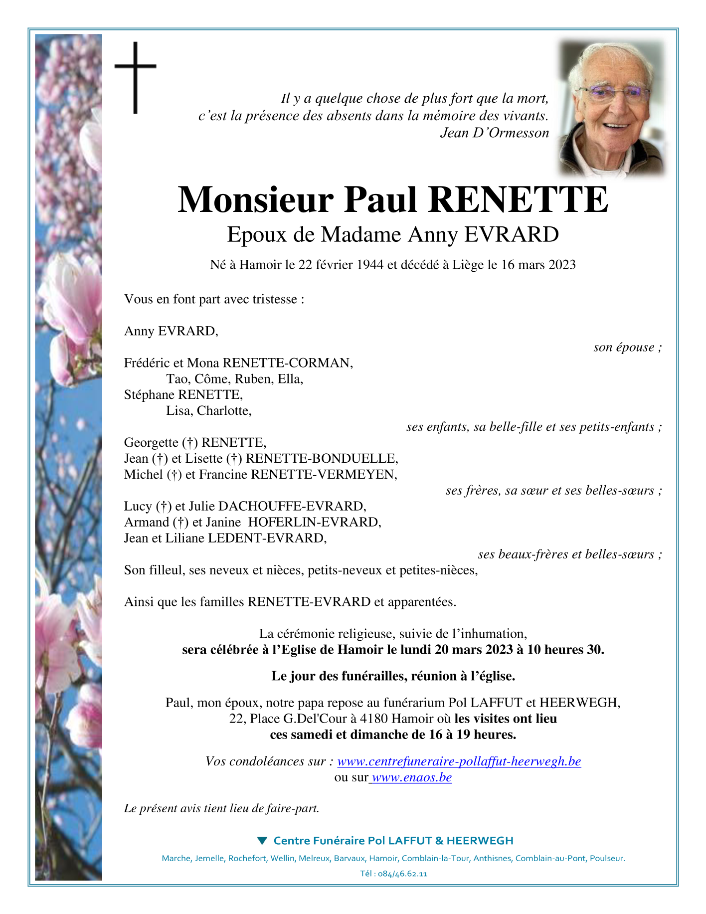 Décédé à Liège (4000) le jeudi 16 mars 2023 à l'âge de 79 ans
