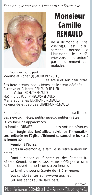 Décédé à Libramont (6800) le mercredi 18 février 2015 à l'âge de 84 ans