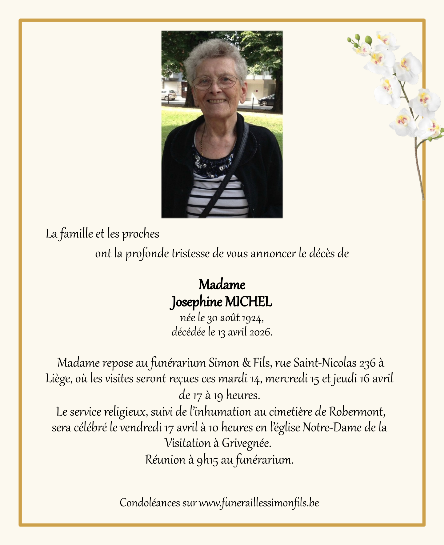 Décédée à Saint-Nicolas (Lg.) (4420) le lundi 13 avril 2026 à l'âge de 101 ans