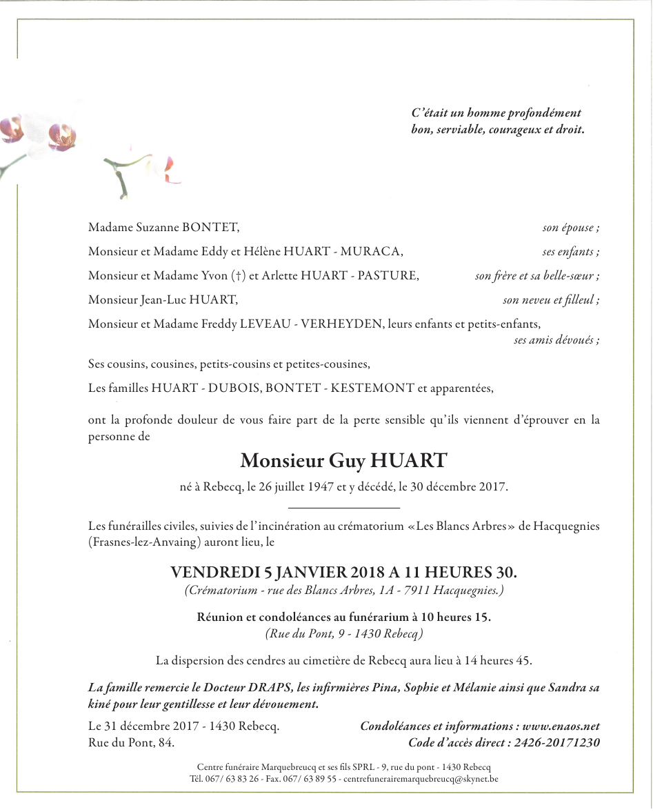 Fallecido en Rebecq (1430) el sábado, 30 de diciembre de 2017 a la edad de 70 años
