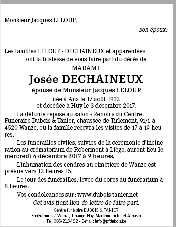 Décédée à Huy (4500) le dimanche 3 décembre 2017 à l'âge de 85 ans