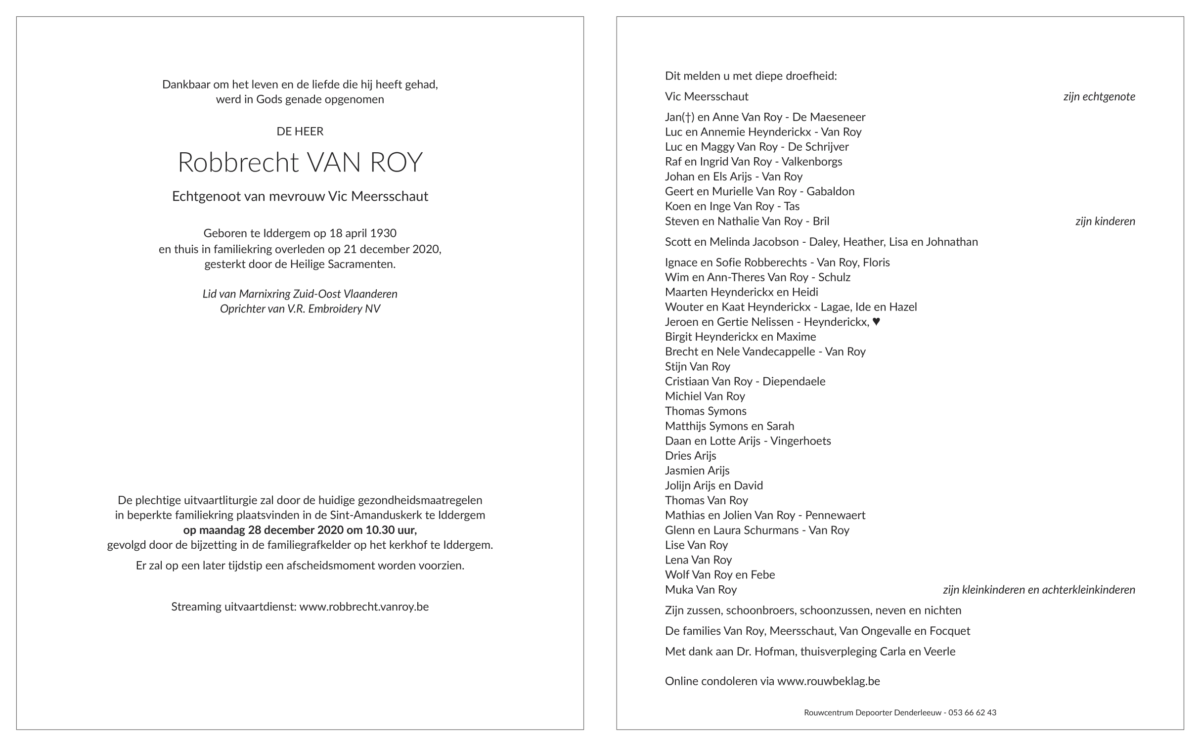 Died in Iddergem (9472) on 21 December 2020 at the age of 90 years
