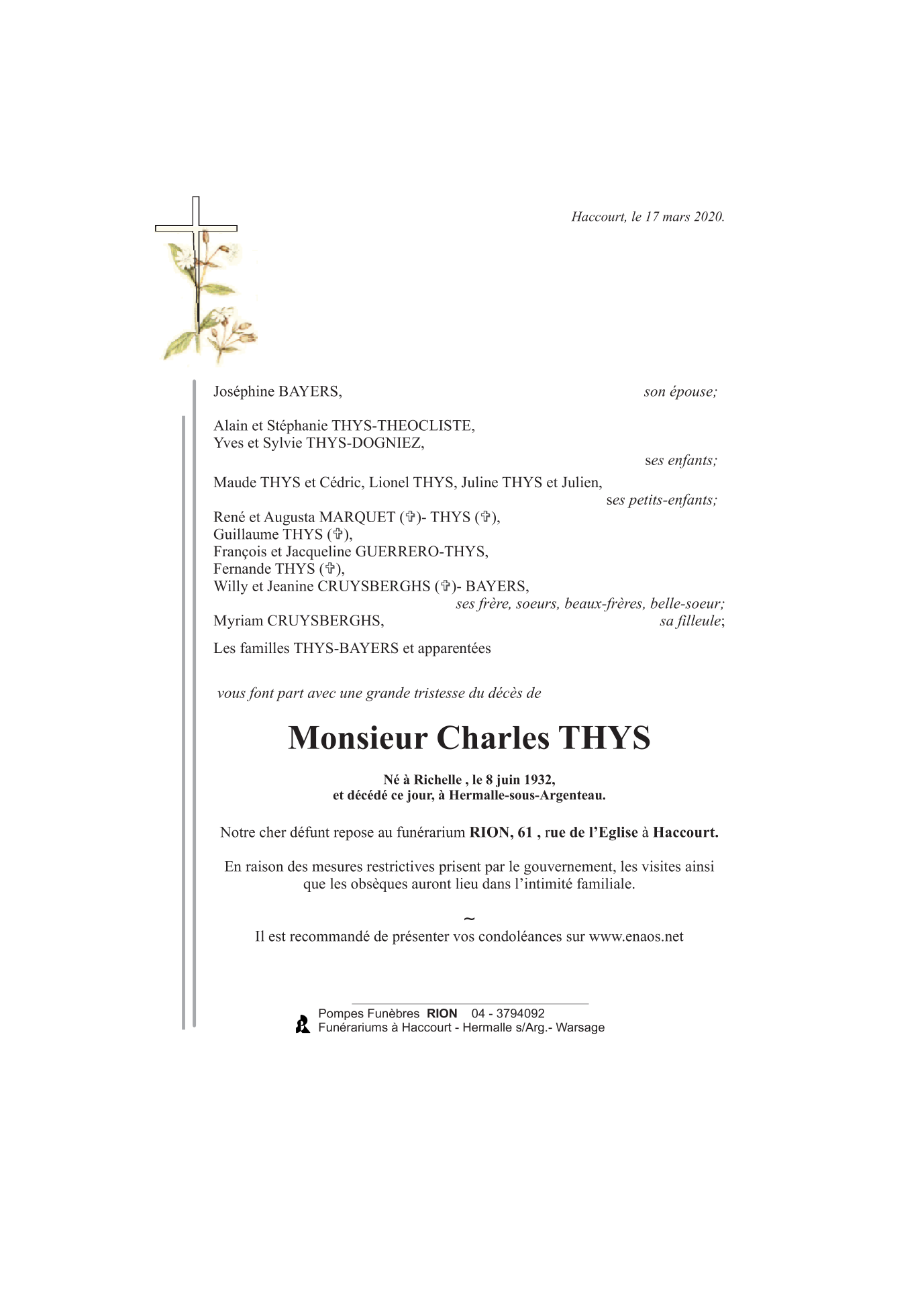 Décédé à Hermalle-sous-Argenteau (4681) le mardi 17 mars 2020 à l'âge de 87 ans