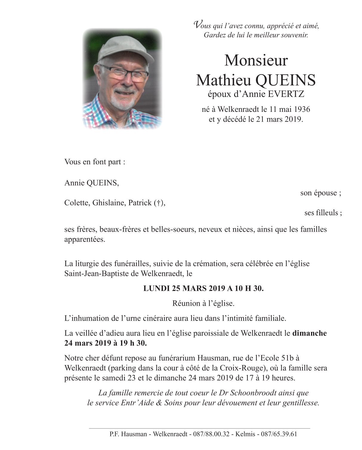 Décédé à Welkenraedt (4840) le jeudi 21 mars 2019 à l'âge de 82 ans
