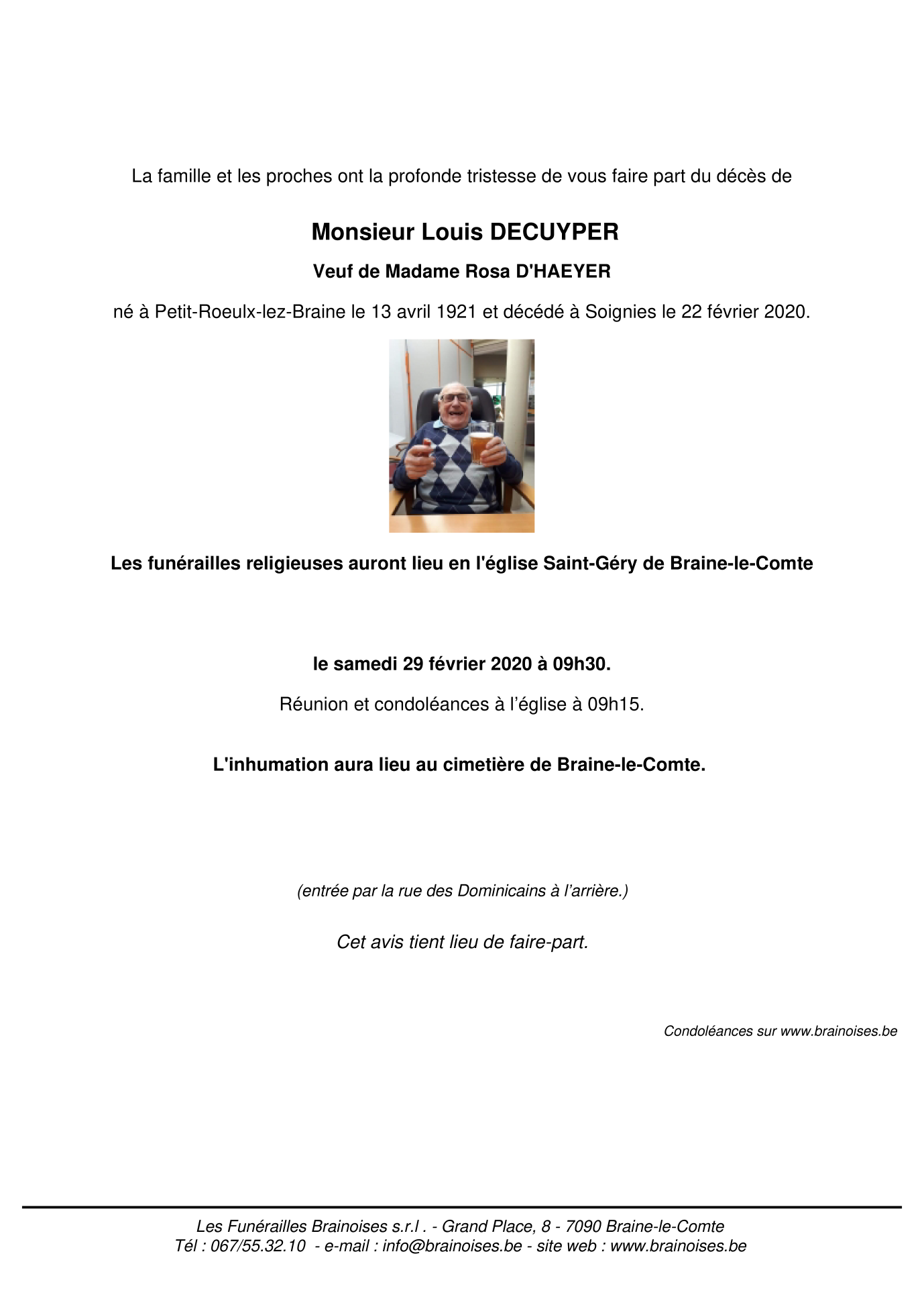 Fallecido en Soignies (7060) el sábado, 22 de febrero de 2020 a la edad de 98 años