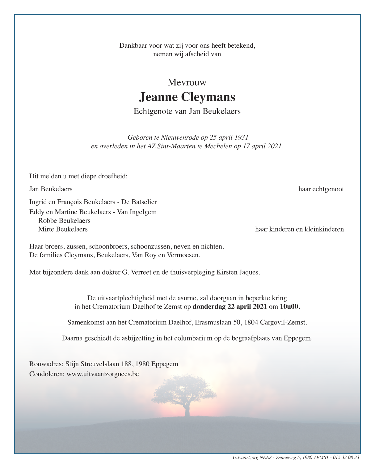 Fallecida en Mechelen (2800) el sábado, 17 de abril de 2021 a la edad de 89 años