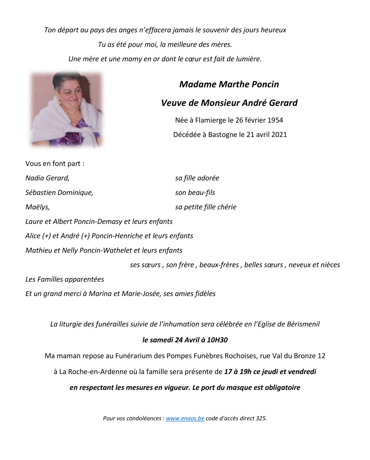 Décédée à Bastogne (6600) le mercredi 21 avril 2021 à l'âge de 67 ans