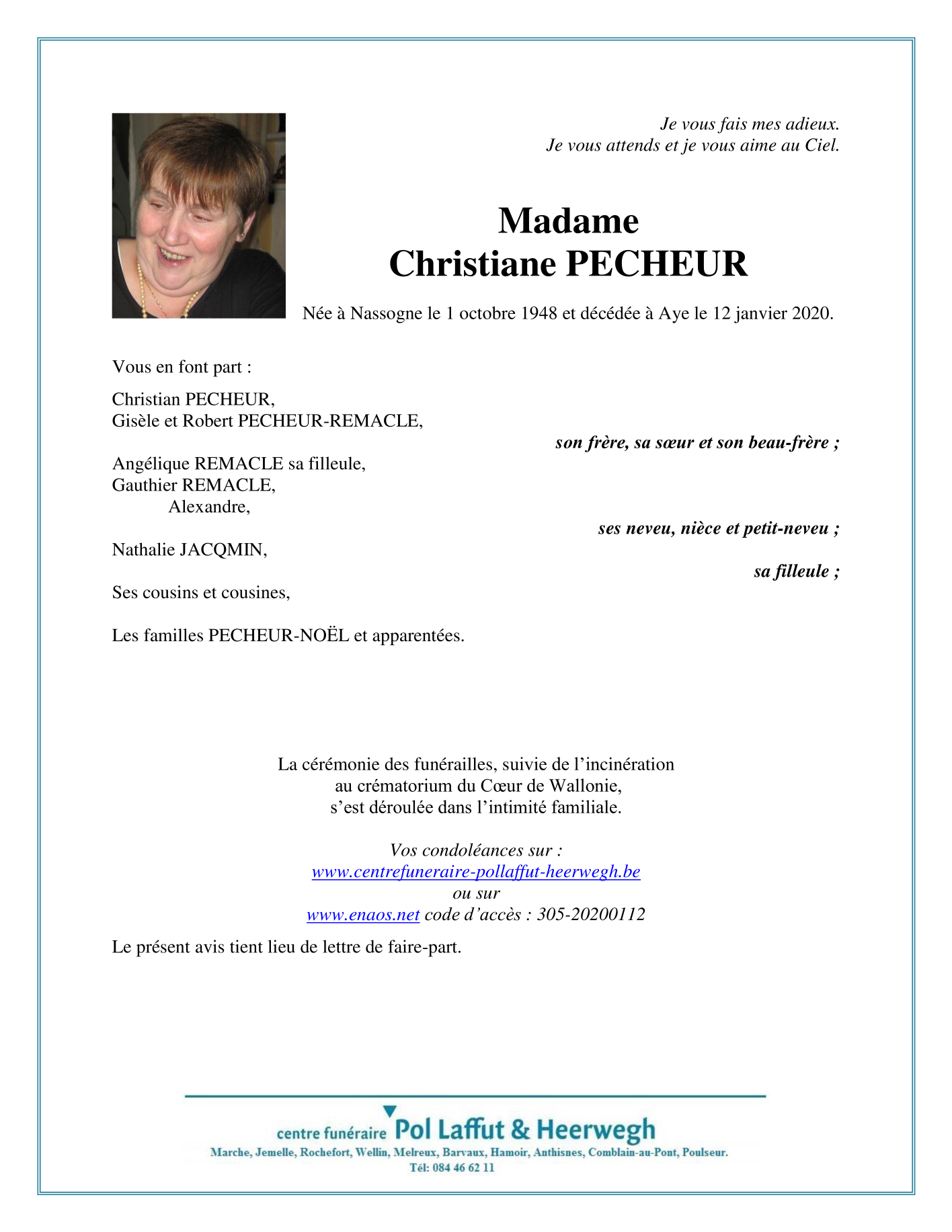 Décédée à Marche-en-Famenne (6900) le dimanche 12 janvier 2020 à l'âge de 71 ans