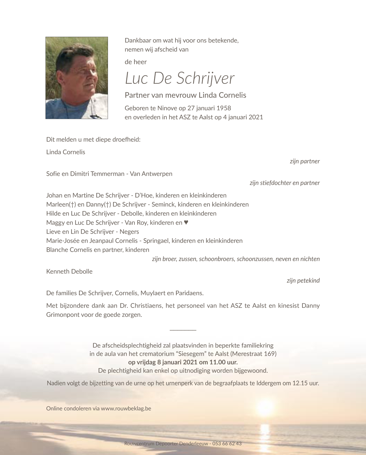 Décédé à Aalst (9300) le lundi 4 janvier 2021 à l'âge de 62 ans