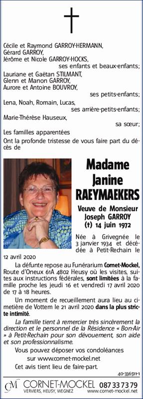 Décédée à Verviers (4800) le dimanche 12 avril 2020 à l'âge de 86 ans
