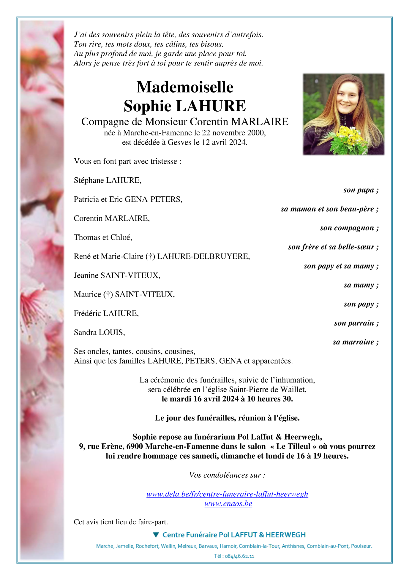 Décédée à Gesves (5340) le vendredi 12 avril 2024 à l'âge de 23 ans