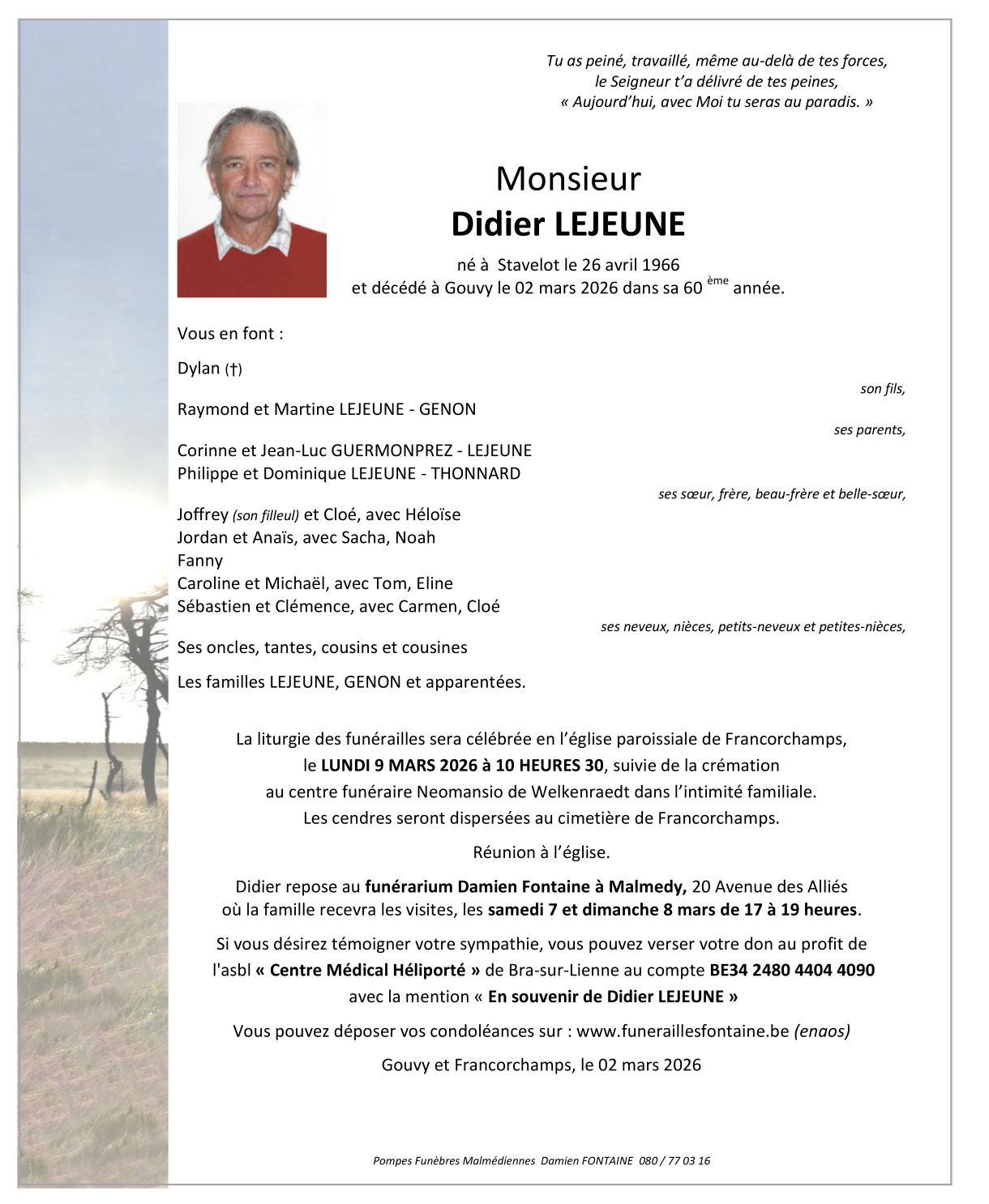Décédé à Gouvy (6670) le lundi 2 mars 2026 à l'âge de 59 ans