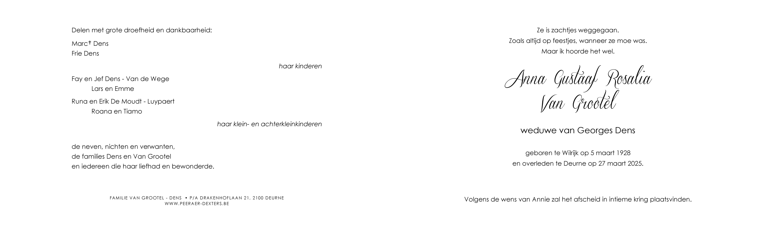 Décédée à Deurne (Antwerpen) (2100) le jeudi 27 mars 2025 à l'âge de 97 ans