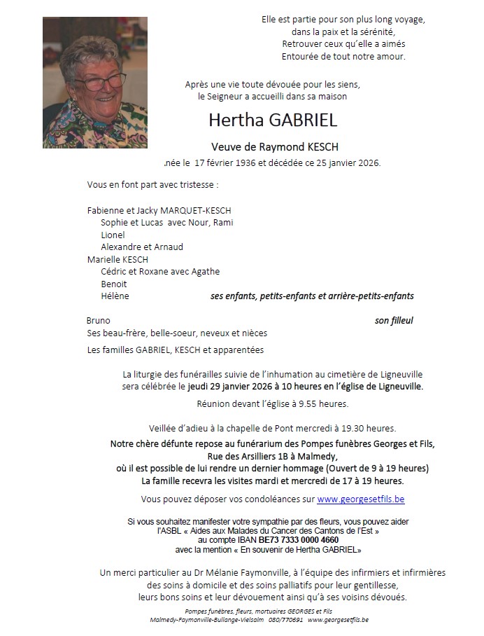 Décédée à Malmedy (4960) le dimanche 25 janvier 2026 à l'âge de 89 ans