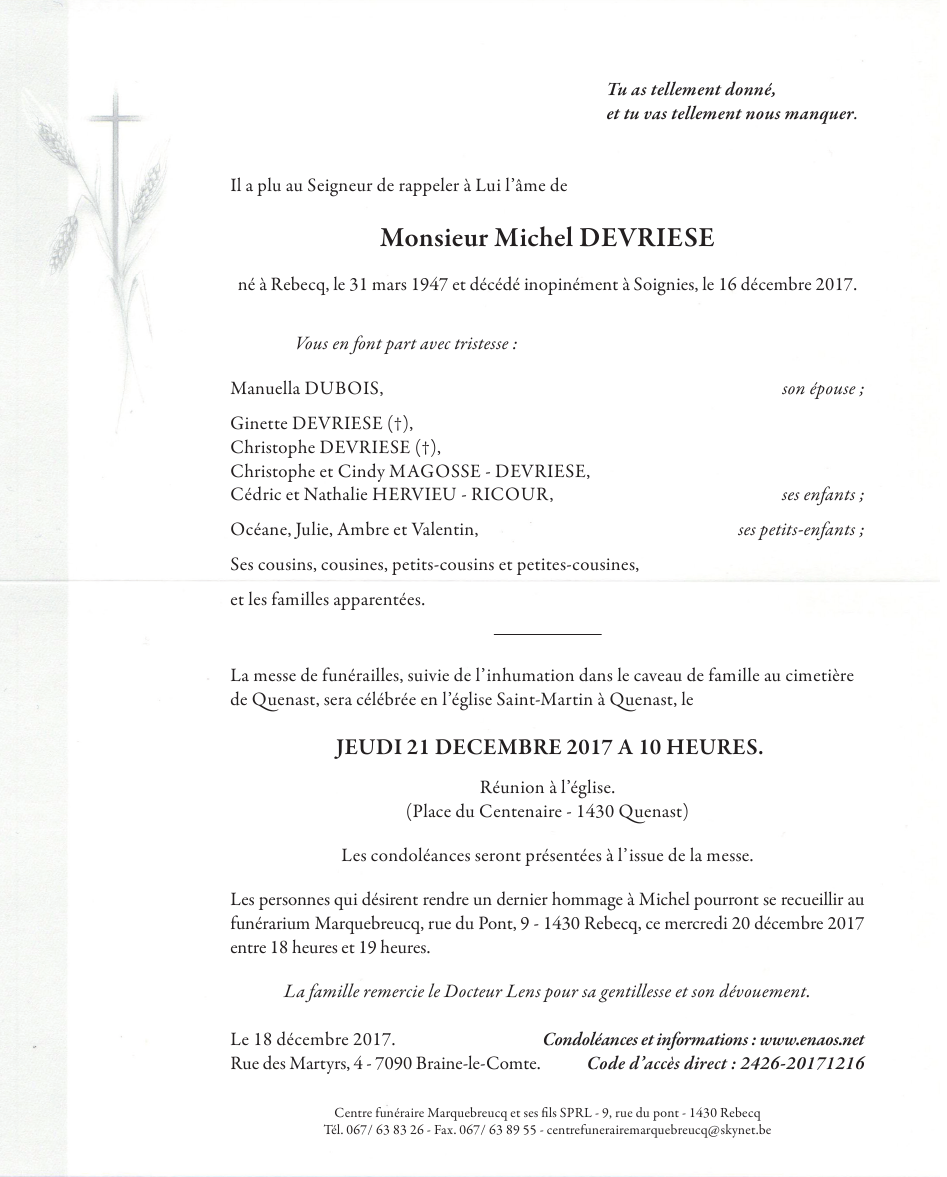 Décédé à Soignies (7060) le samedi 16 décembre 2017 à l'âge de 70 ans