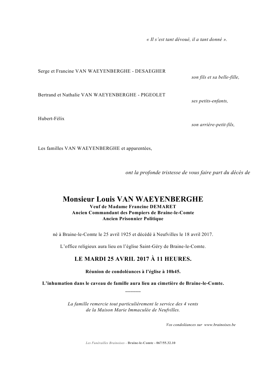 Né à Braine-le-Comte (7090) le samedi 25 avril 1925