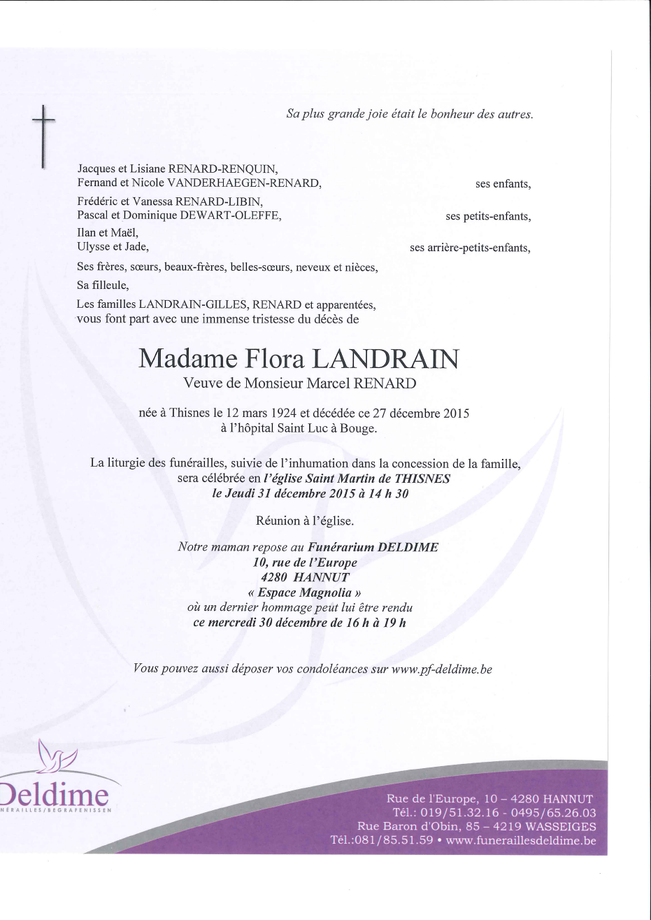 Décédée à Namur (5000) le dimanche 27 décembre 2015 à l'âge de 91 ans
