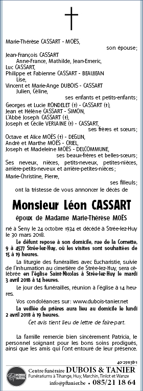 Died in Strée-lez-Huy (4577) on 30 March 2018 at the age of 83 years