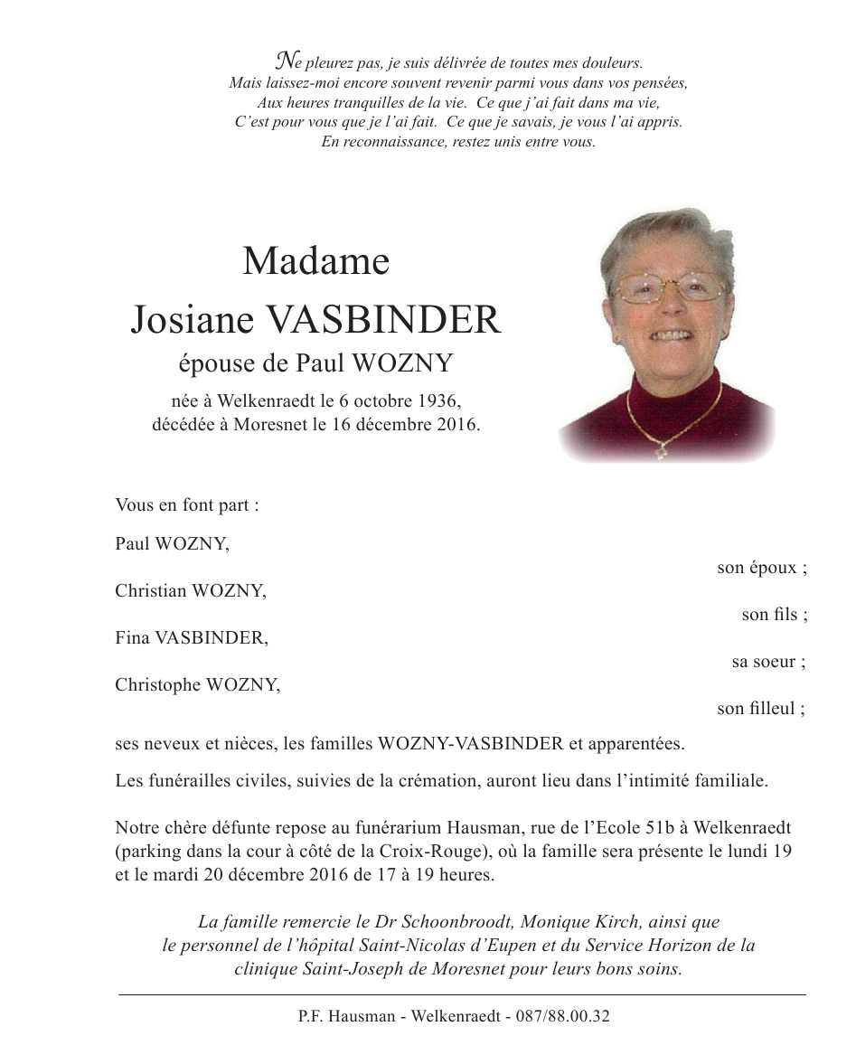 Décédée à Moresnet (4850) le vendredi 16 décembre 2016 à l'âge de 80 ans