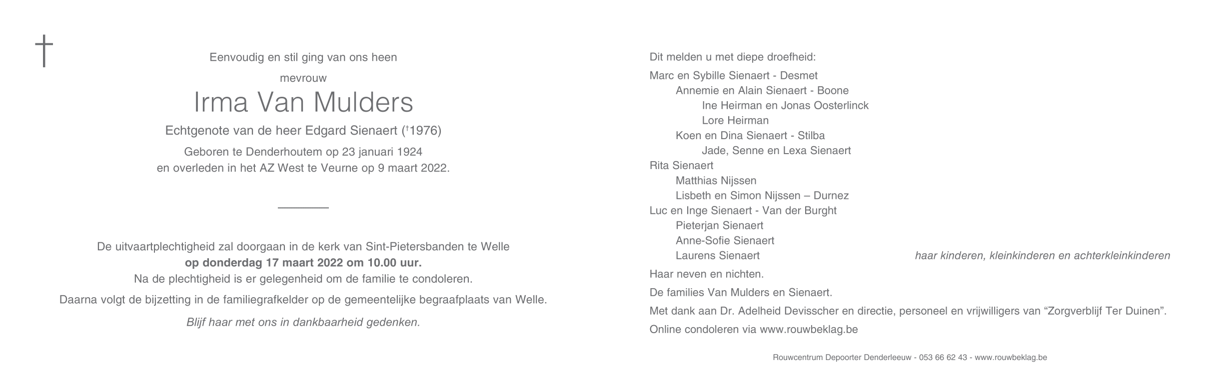 Overleden te Veurne (8630) op woensdag 9 maart 2022 op 98-jarige leeftijd