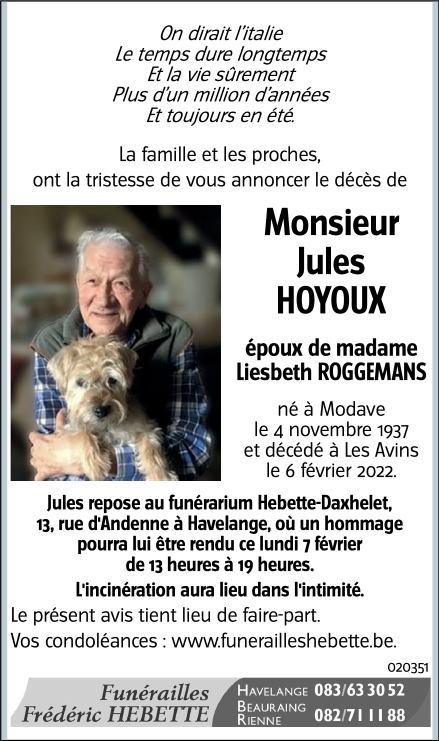 Décédé à Hoyoux (4560) le dimanche 6 février 2022 à l'âge de 84 ans
