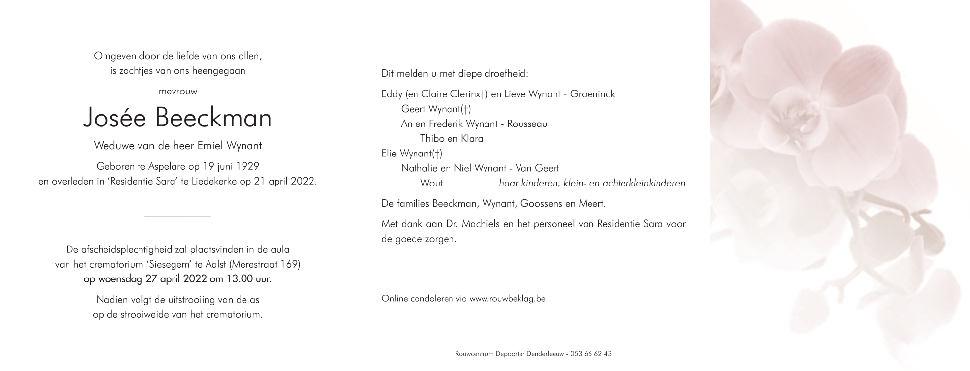 Décédée à Liedekerke (1770) le jeudi 21 avril 2022 à l'âge de 92 ans