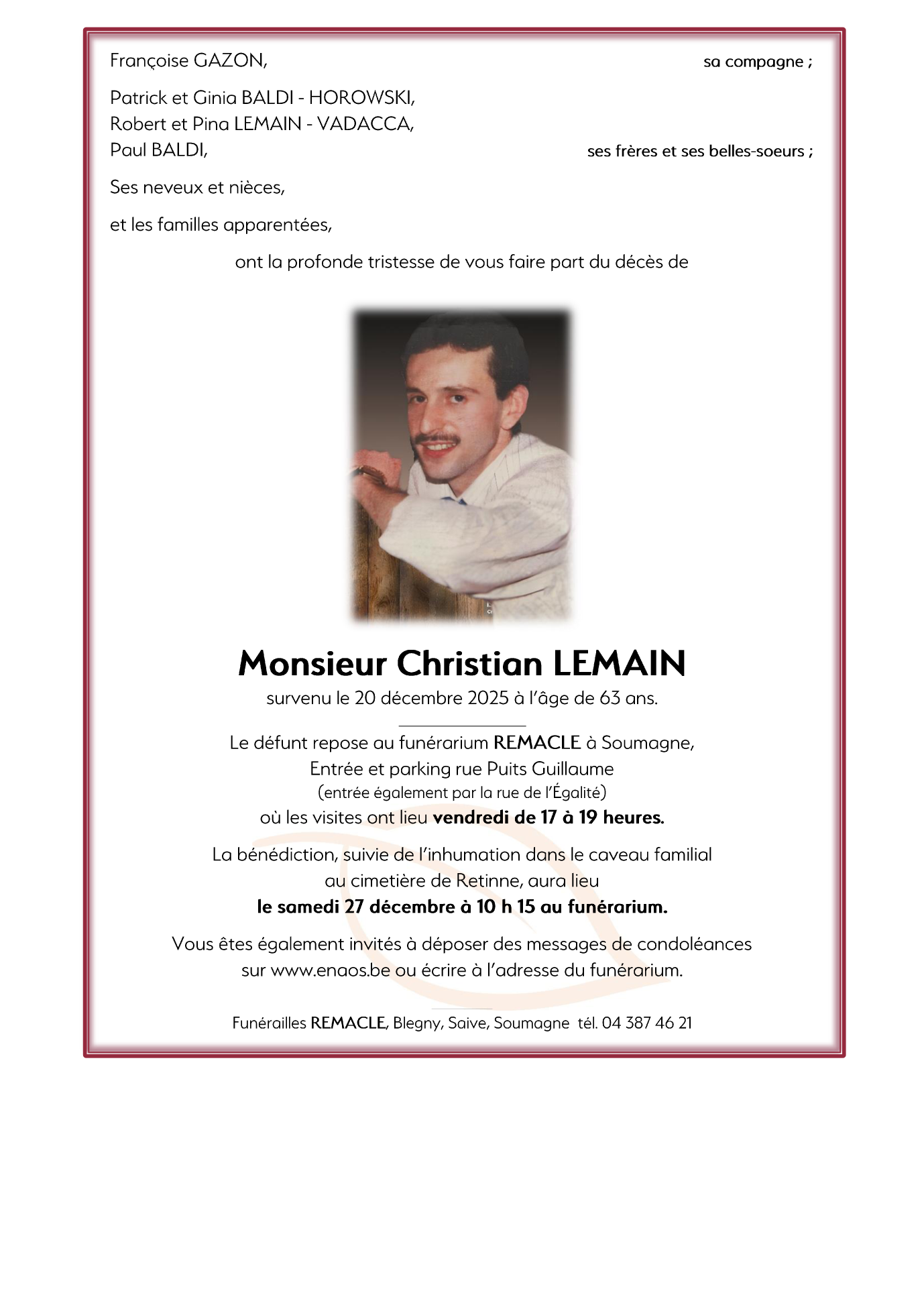 Décédé à Liège (4000) le samedi 20 décembre 2025 à l'âge de 63 ans