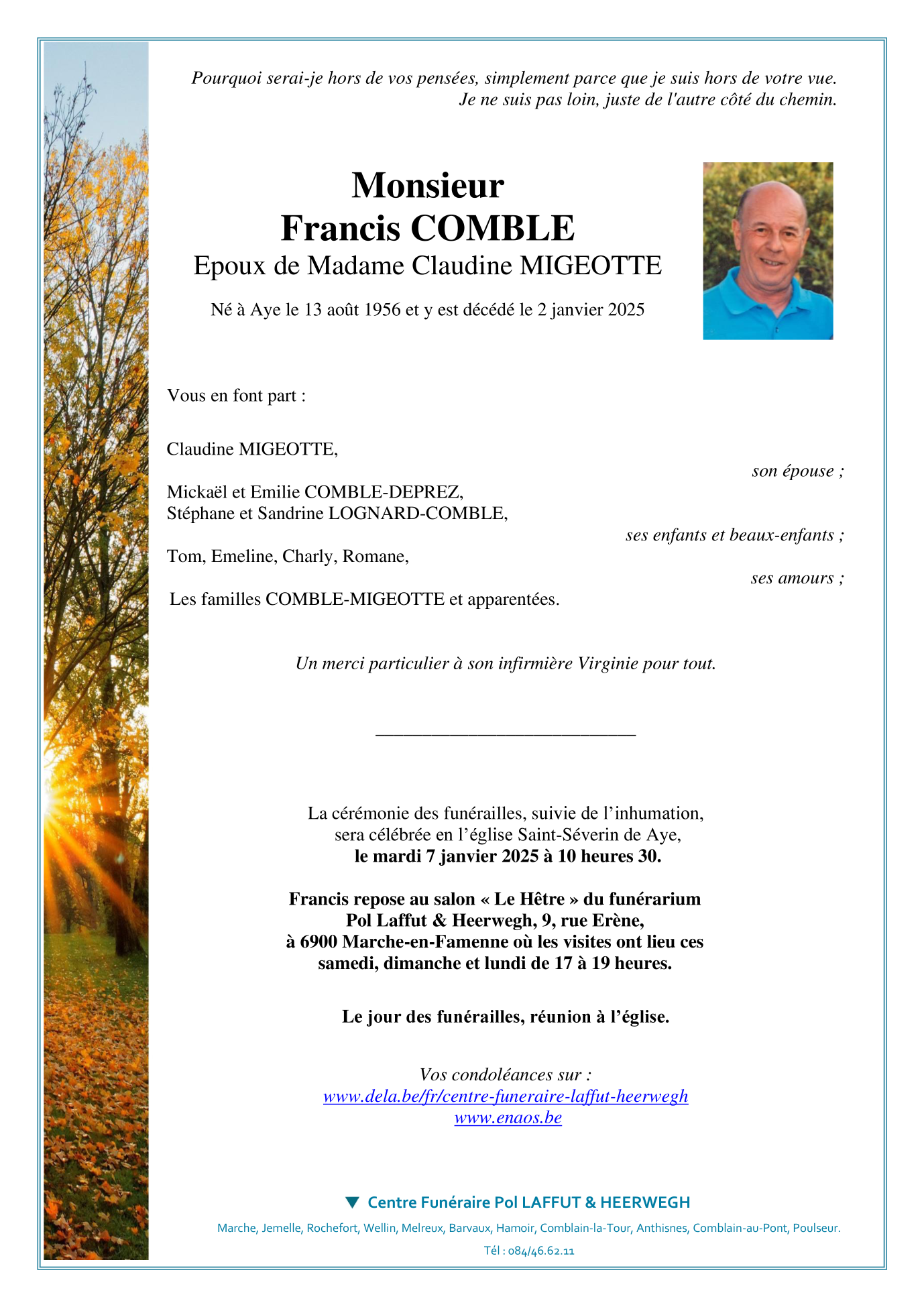 Décédé à Aye (6900) le jeudi 2 janvier 2025 à l'âge de 68 ans