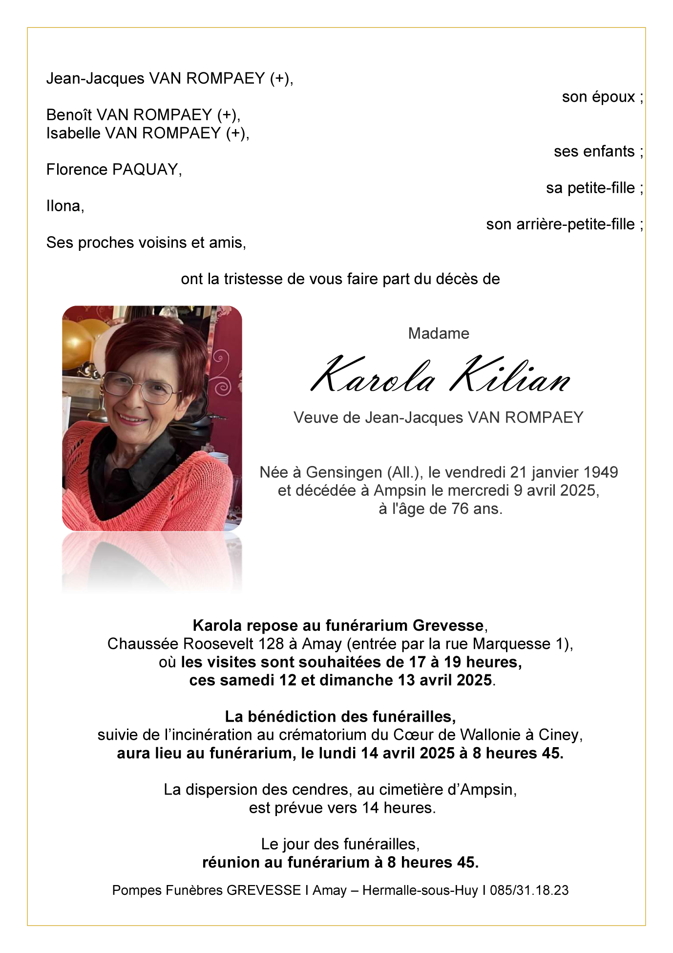 Décédée à Ampsin (4540) le mercredi 9 avril 2025 à l'âge de 76 ans