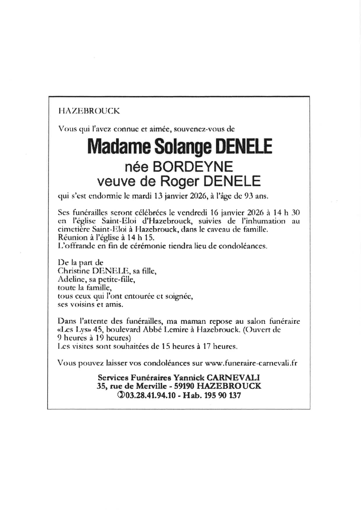 Veuve de monsieur Roger DENELE