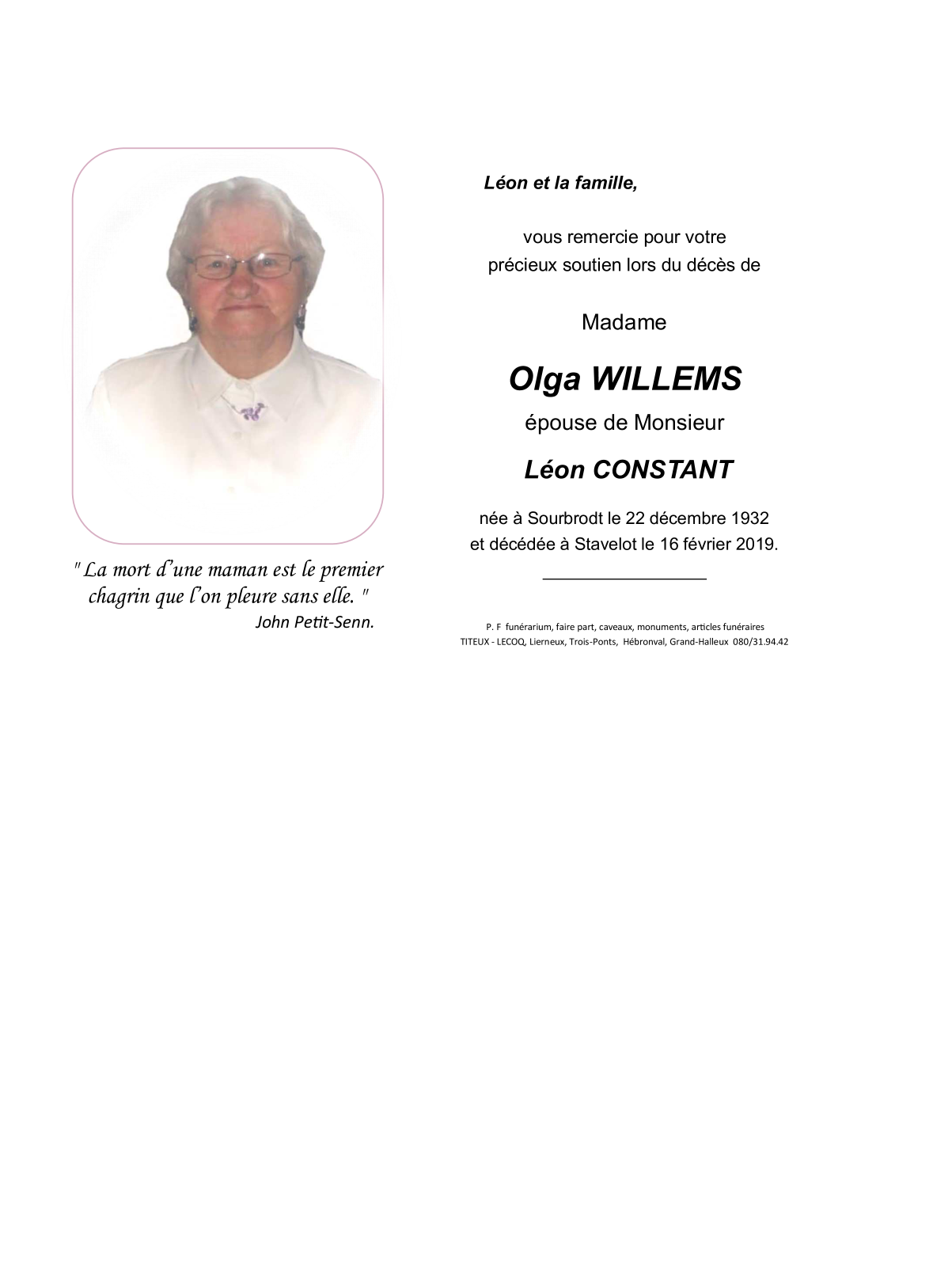 Died in Stavelot (4970) on 16 February 2019 at the age of 86 years