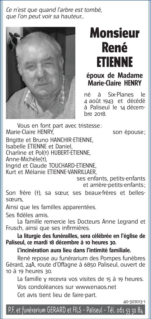 Died in Paliseul (6850) on 14 December 2018 at the age of 75 years