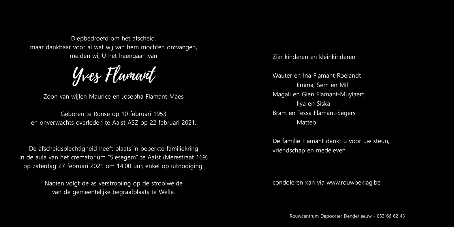 Décédé à Aalst (9300) le lundi 22 février 2021 à l'âge de 68 ans
