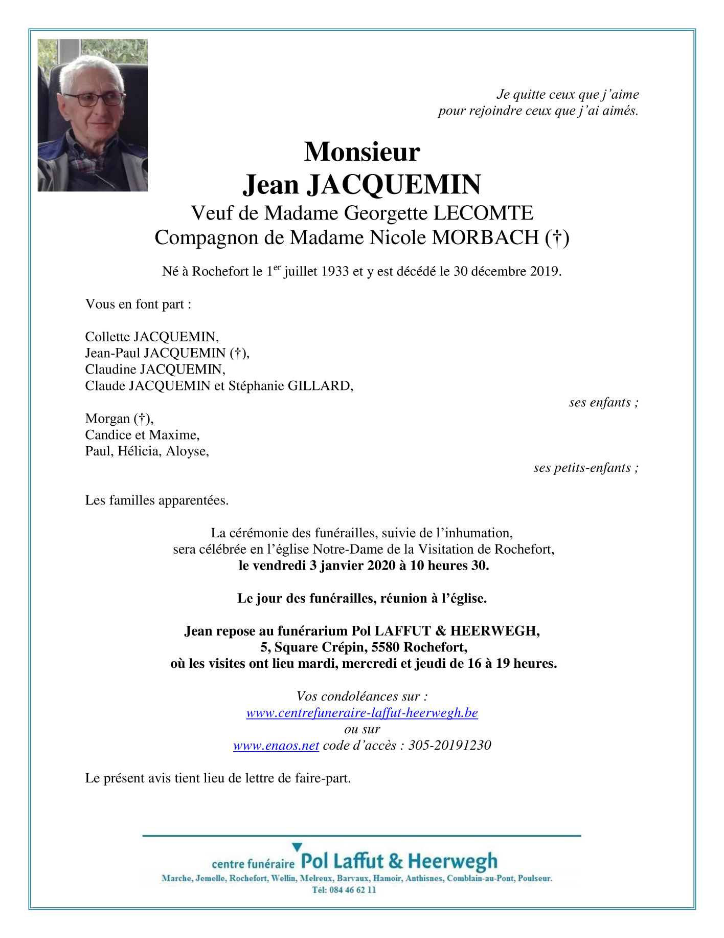 Décédé à Rochefort (5580) le lundi 30 décembre 2019 à l'âge de 86 ans