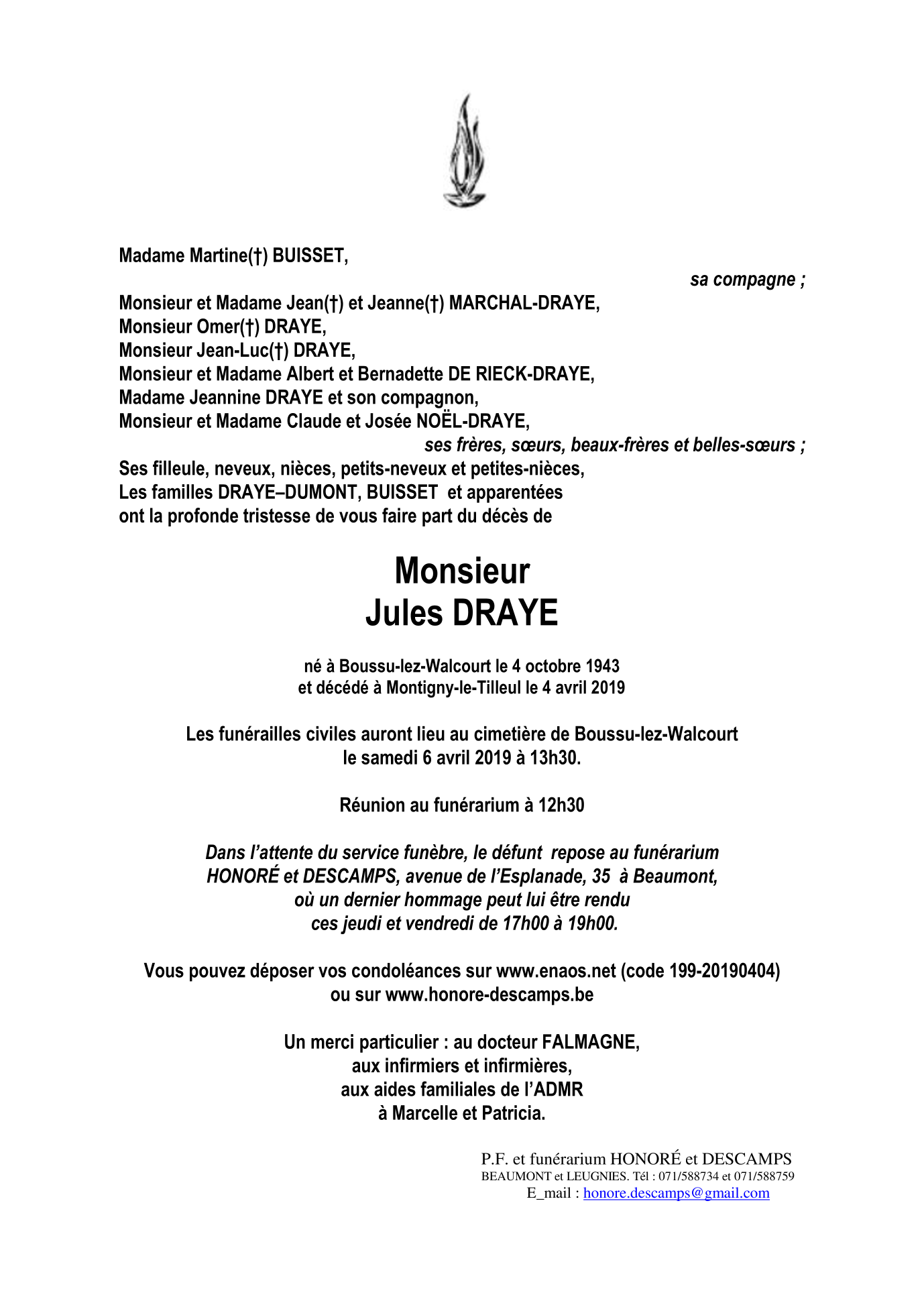 Décédé à Montigny-le-Tilleul (6110) le jeudi 4 avril 2019 à l'âge de 75 ans