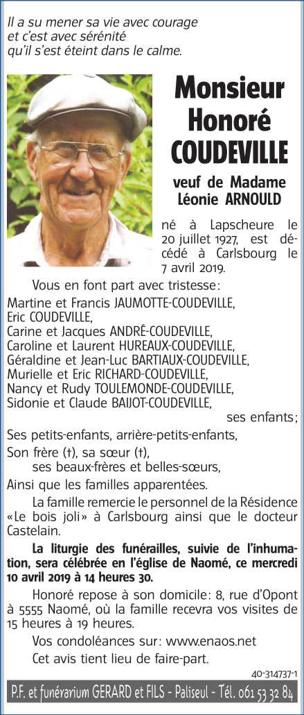Died in Carlsbourg (6850) on 07 April 2019 at the age of 91 years