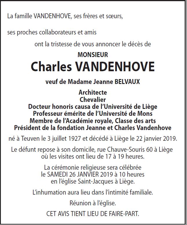 Overleden te Liège (4000) op dinsdag 22 januari 2019 op 91-jarige leeftijd