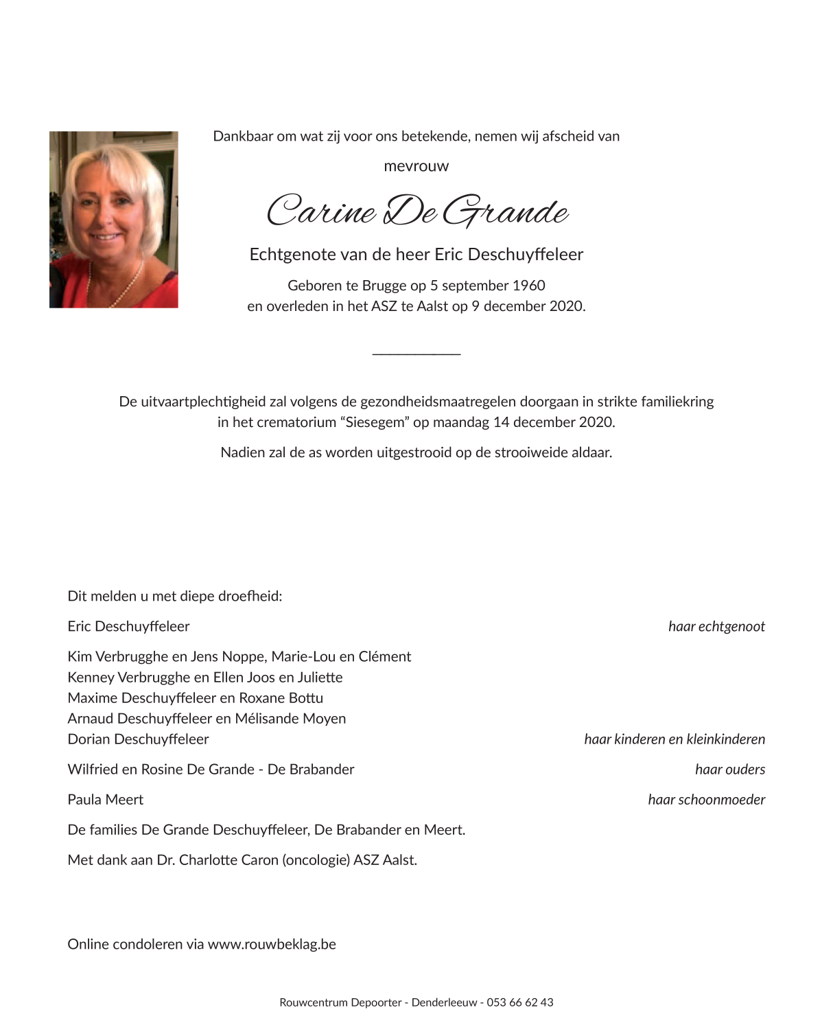 Décédée à Aalst (9300) le mercredi 9 décembre 2020 à l'âge de 60 ans