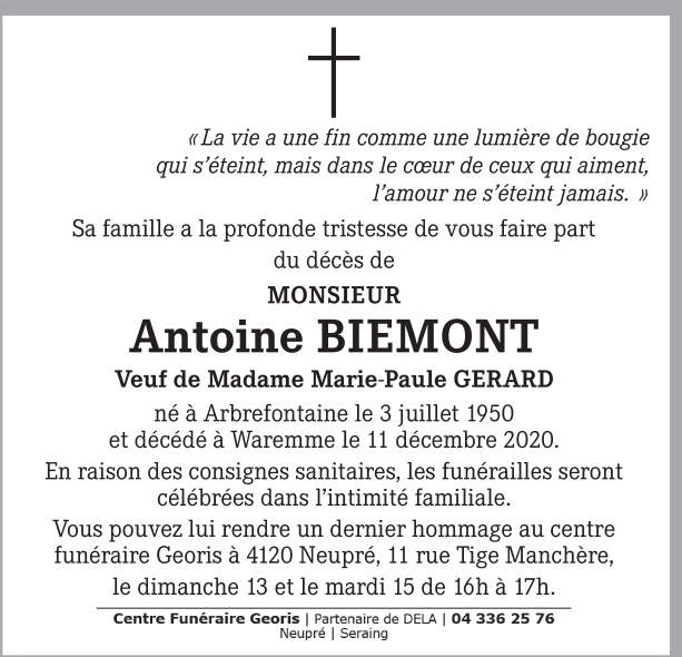 Décédé à Waremme (4300) le vendredi 11 décembre 2020 à l'âge de 70 ans