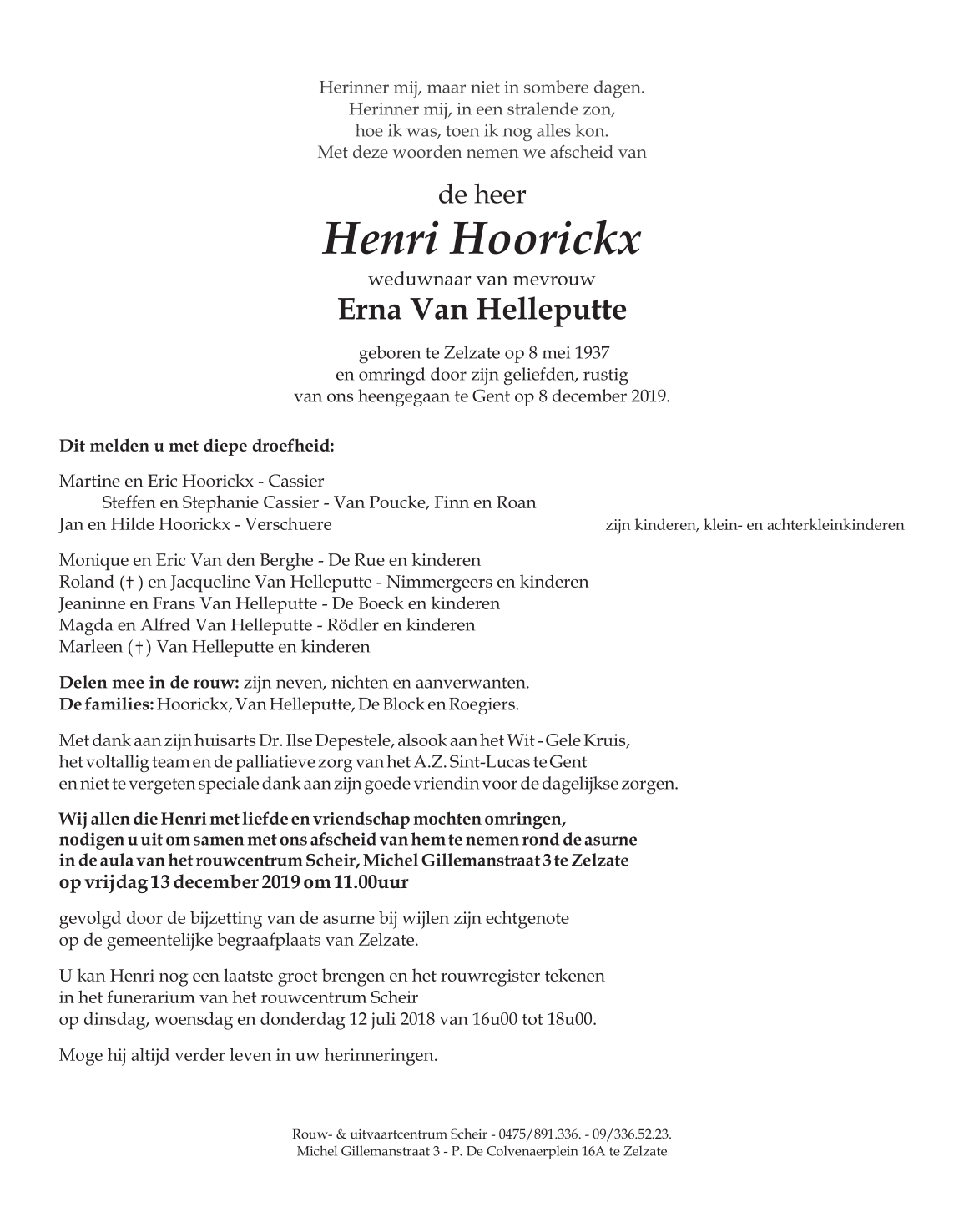 Décédé à Gent (9000) le dimanche 8 décembre 2019 à l'âge de 82 ans