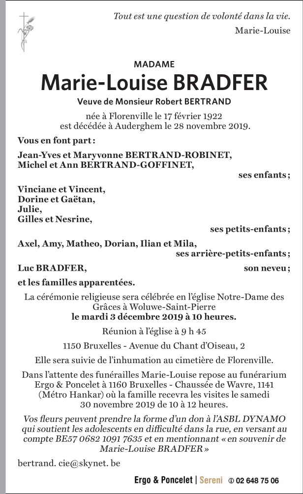 Décédée à Auderghem (1160) le jeudi 28 novembre 2019 à l'âge de 97 ans