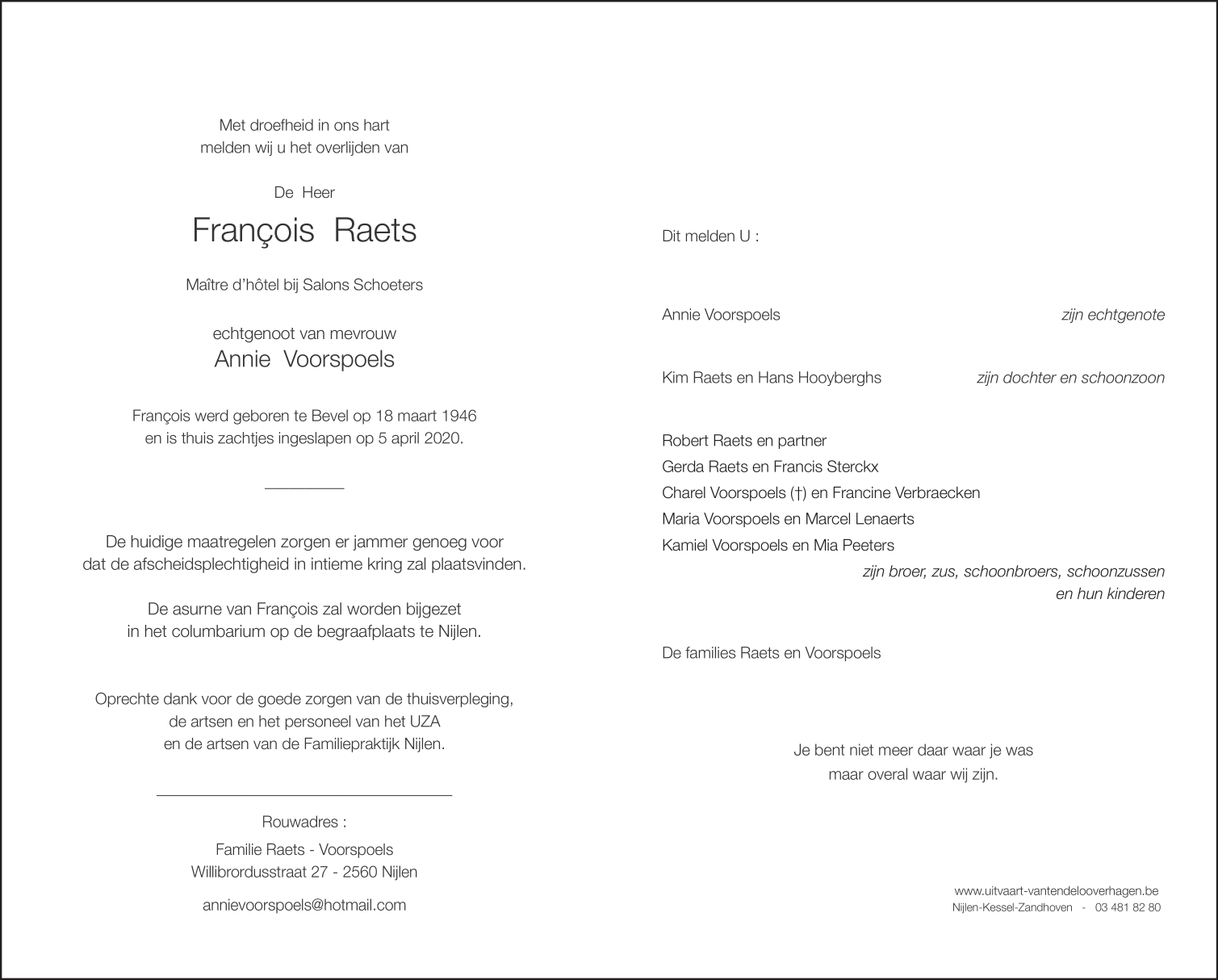 Overleden te Nijlen (2560) op zondag 5 april 2020 op 74-jarige leeftijd