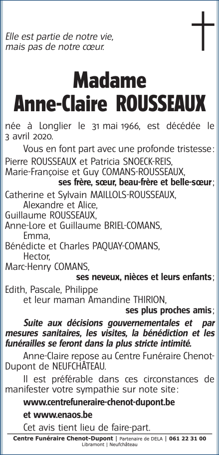 Fallecida en Florenville (6820) el viernes, 3 de abril de 2020 a la edad de 53 años
