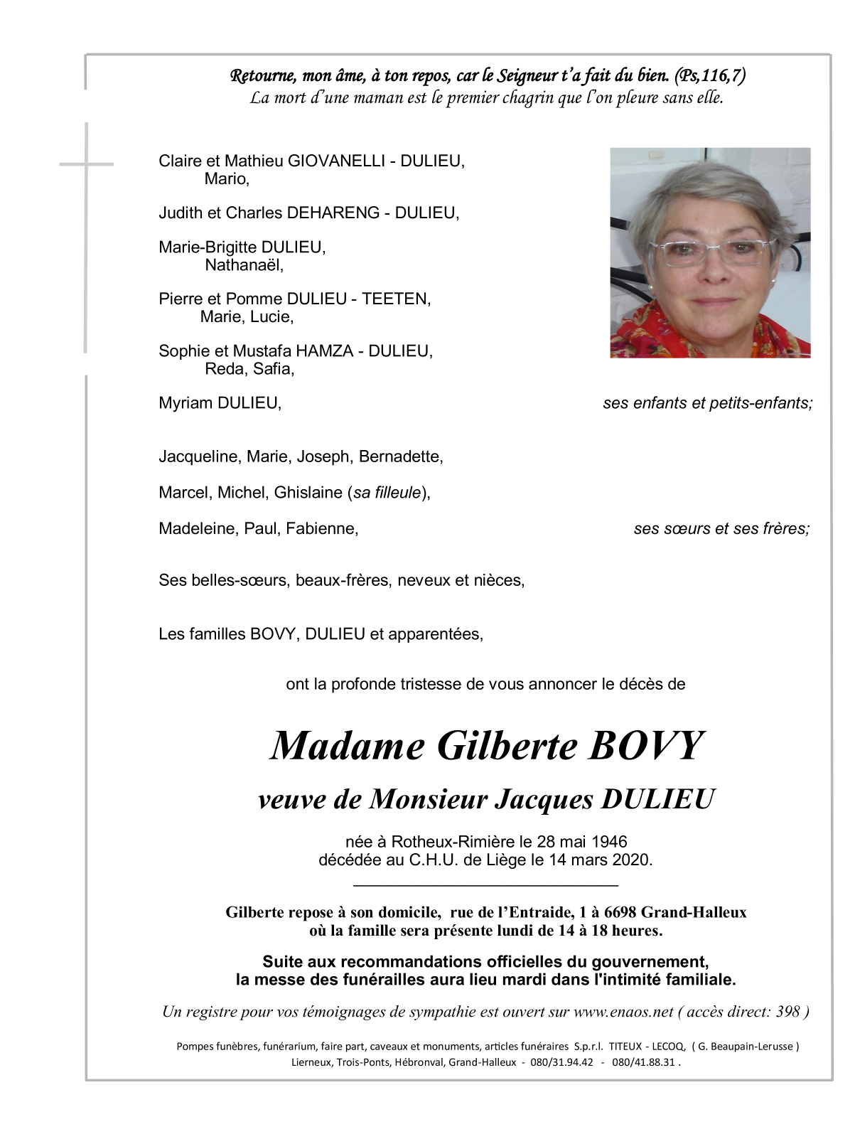 Fallecida en Liège (4000) el sábado, 14 de marzo de 2020 a la edad de 73 años