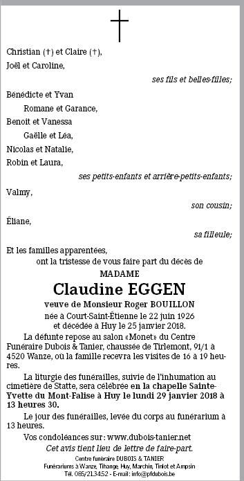 Décédée à Huy (4500) le jeudi 25 janvier 2018 à l'âge de 91 ans