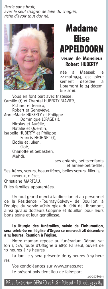 Décédée à Libramont (6800) le samedi 24 décembre 2016 à l'âge de 82 ans