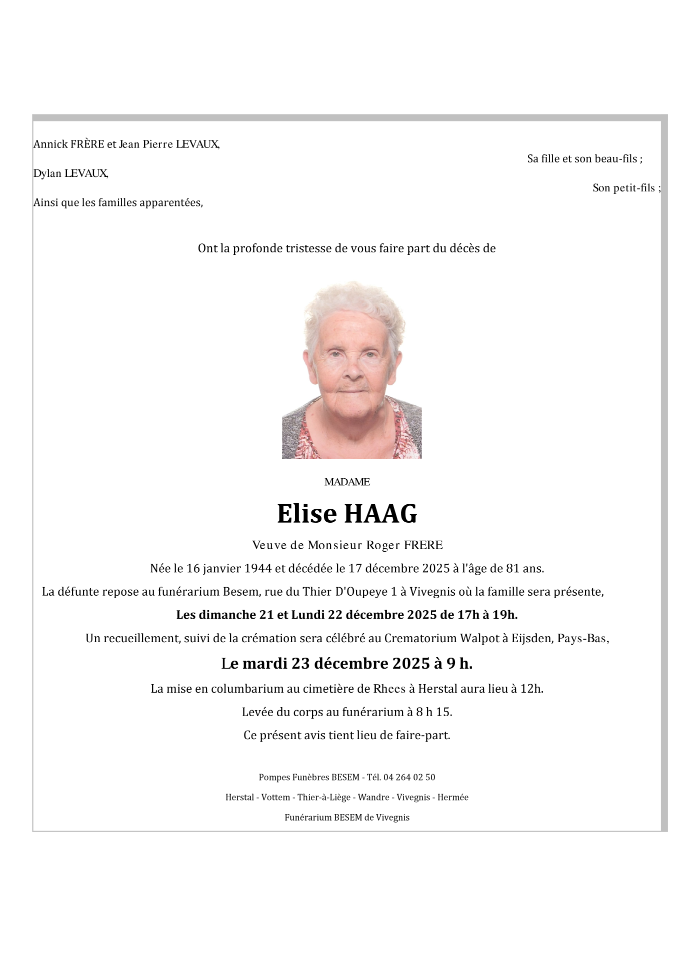 Décédée à Hermalle-sous-Argenteau (4681) le mercredi 17 décembre 2025 à l'âge de 81 ans