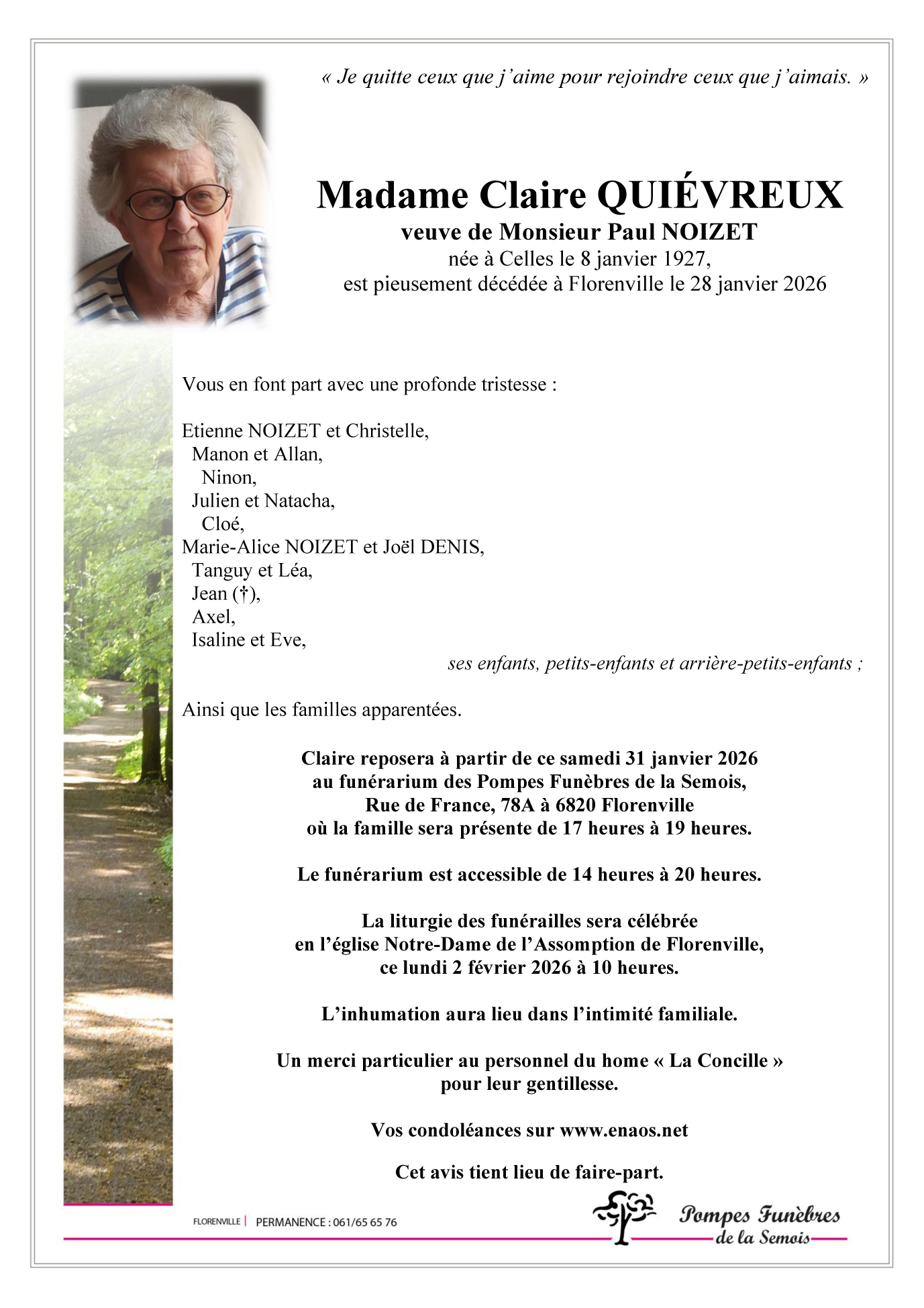 Fallecida en Florenville (6820) el miércoles, 28 de enero de 2026 a la edad de 99 años