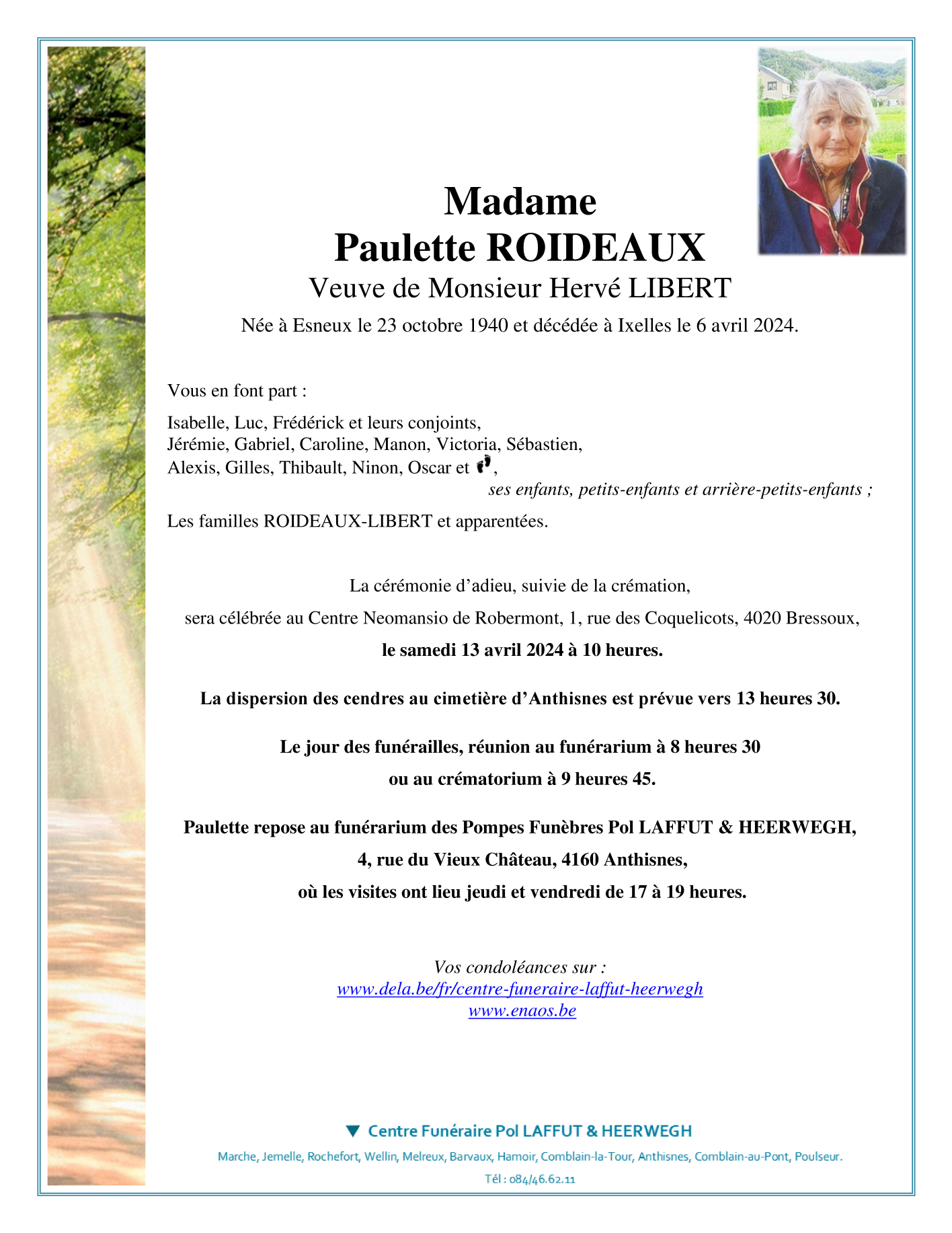 Décédée à Ixelles (1050) le samedi 6 avril 2024 à l'âge de 83 ans