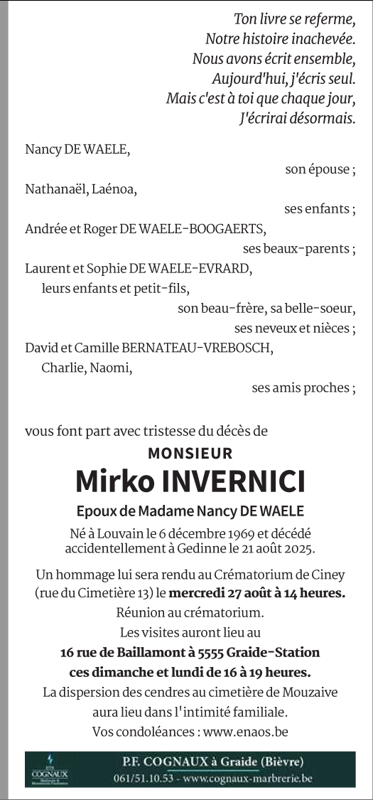 Décédé à Gedinne (5575) le jeudi 21 août 2025 à l'âge de 55 ans